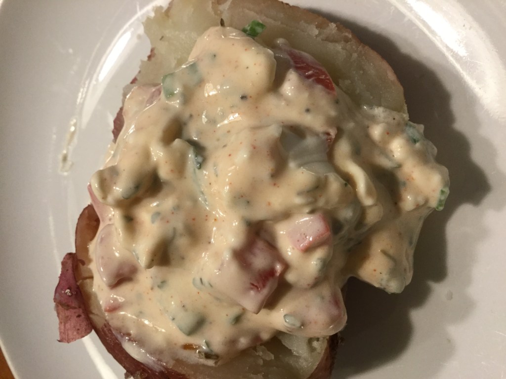 For the bell pepper dip: I finally got to try Quark. I do agree with the reviews that this kind tastes similar to sour cream, which apparently isn’t how it’s supposed to taste. But this dip is a tasty replacement for using sour cream on baked potatoes, so I’m not complaining. I also don’t get using the beurre noisette in the recipe; it doesn’t need it.