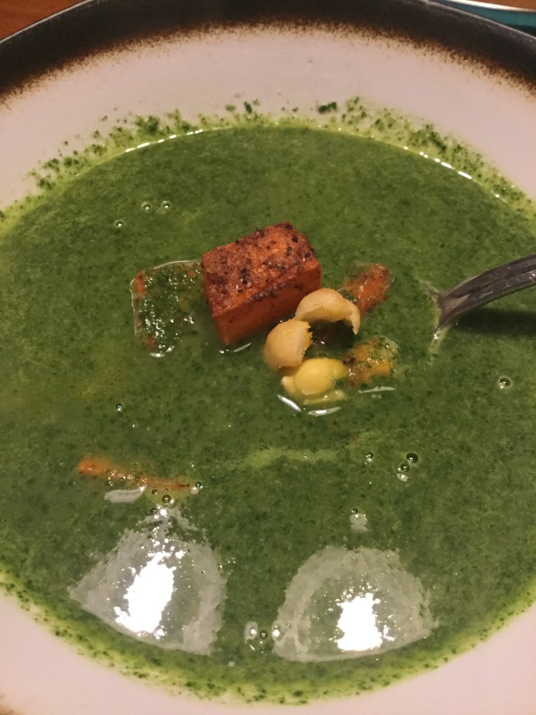 The star of this dish is the vegetables roasted in ras el hanout. Without it the soup itself is very healthy and floral tasting since it’s made of watercress and spinach. The soup is a little thin and okay, but when the ras el hanout seeps into the soup, WOW! The spice adds a little kick that is just enough and really accentuates, and not overwhelm the flavor of the soup. My friend, who lived in the Mid-East said that watercress isn’t a super common green found there, so I’m wondering if that’s an influence from the author living in England. I, personally, don’t eat too much watercress here in the states, although I found it in my local international grocery store. I enjoyed having this soup for lunch in this cold January month, especially with the kick from ras el hanout.