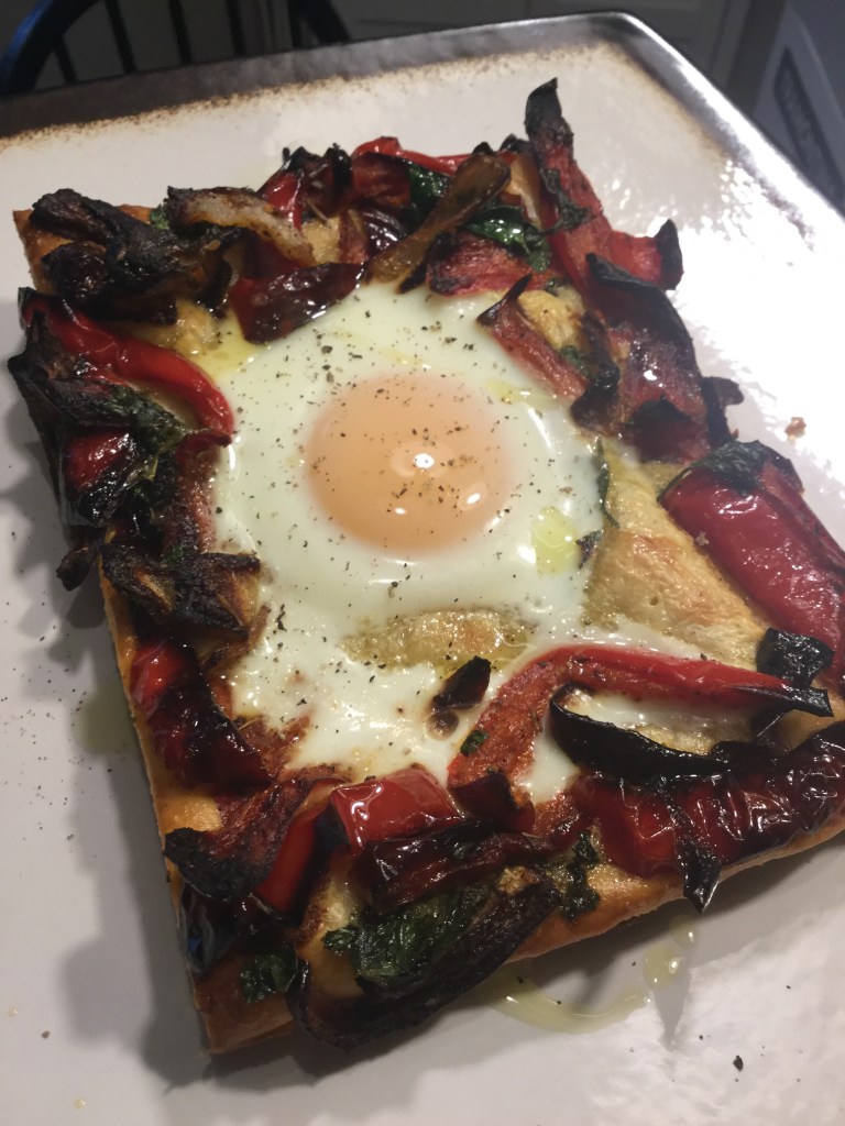 This has to be one of my favorite dishes that I’ve cooked in awhile. The roasted red peppers were nice and sweet. I loved the roasted onions. Also, I love the way egg yolk congeals when eggs are baked. The white gets cooked and the yolk becomes a gelatinous state halfway between liquid and solid. My boyfriend agreed that this had to be one of the best dishes that he has tried for breakfast in a long time. It did take some time to make, I thought about roasting the onions and peppers the night before and then baking the galette in the morning. I’m glad I didn’t since I feel like the peppers would have gotten too soft left in the fridge overnight. We enjoyed these with orange juice and hot espresso.