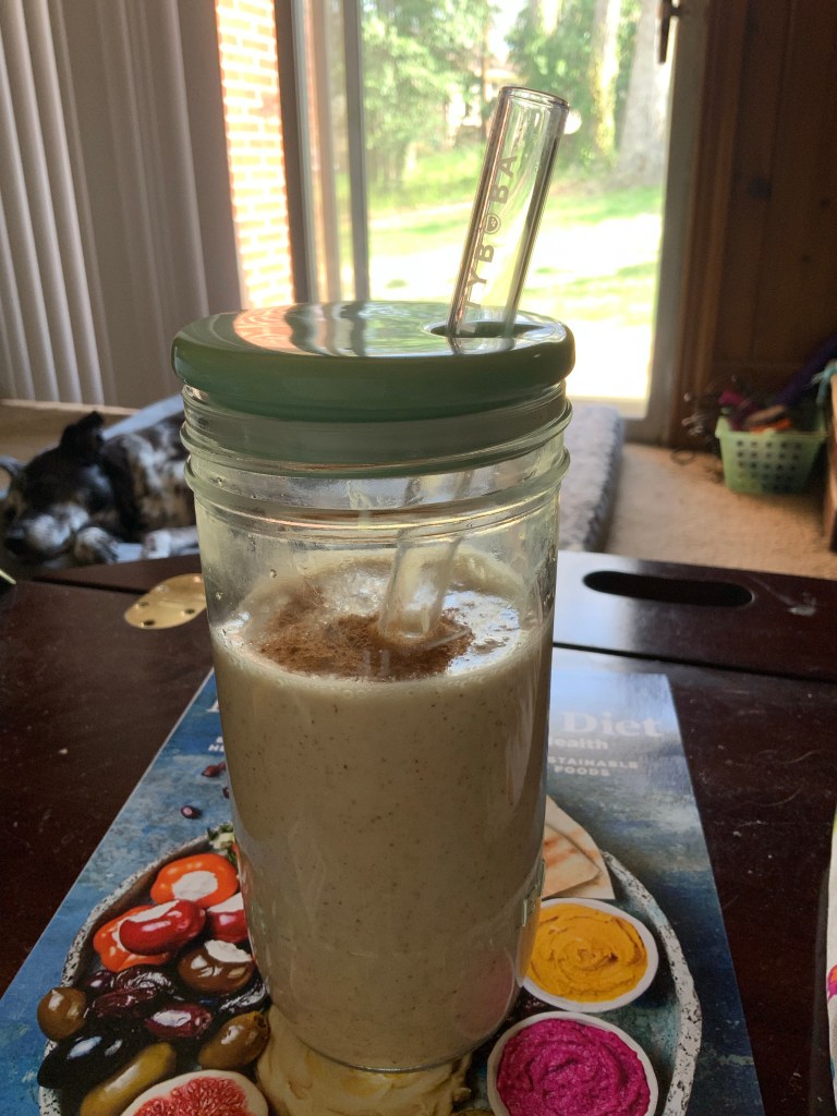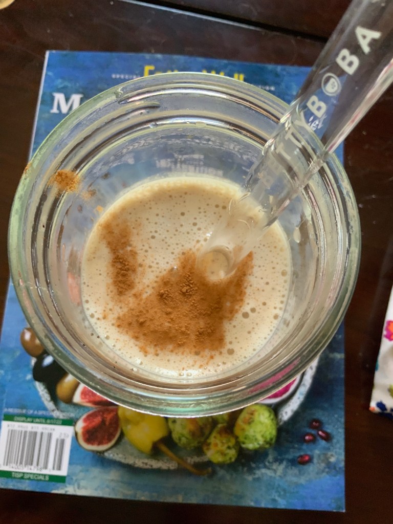 So much yum to start off the day. Honestly I would qualify this more to be a milkshake than a smoothie. There’s no ice cream involved but plenty of milk. I reduced how much milk the recipe called for since the original recipe is measured to 3 servings. But based on the nutritional information, it was plenty for a single serving for breakfast and reducing the milk to a cup from a cup and a half reduces the size and calories. I used almond butter in mine and didn’t measure out the vanilla and almond extracts. It’s topped with cinnamon, yum! I’m enjoying it here out of my new Boba Tea glass from Tea Drops.