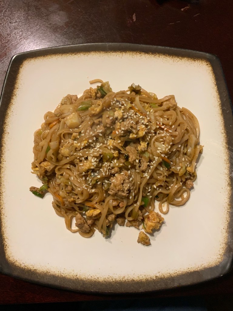 This is the first time he’s given one of the dishes that I’ve cooked a ☹️. His critique is that it tastes too bitter and it would have been better with chicken. I think the sauce is too salty since it lacks anything to balance the soy sauce and rice vinegar. It needs a little bit of sugar and normally I would have added chili oil but I’m having stomach issues today, so I omitted that. I eventually added hoisin sauce on top of mine to balance out the saltiness and add some sweetness.