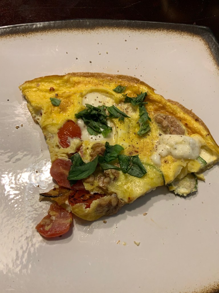 Yum, yum, yum. I love frittata’s and this one was more filling than I had anticipated. Frittata’s are wonderful breakfasts for me since I don’t always have time to cook in the morning and I’m not a fan of cereal. This one includes zucchini, tomatoes, mozzarella cheese, and walnuts. I thought the walnuts were out of place, but they ended up being one of my favorite parts. The nutty taste and the meatiness of the nut really added to the flavor of this egg dish. I topped my slice with fresh black pepper and basil. The entire dish fed me for four days.