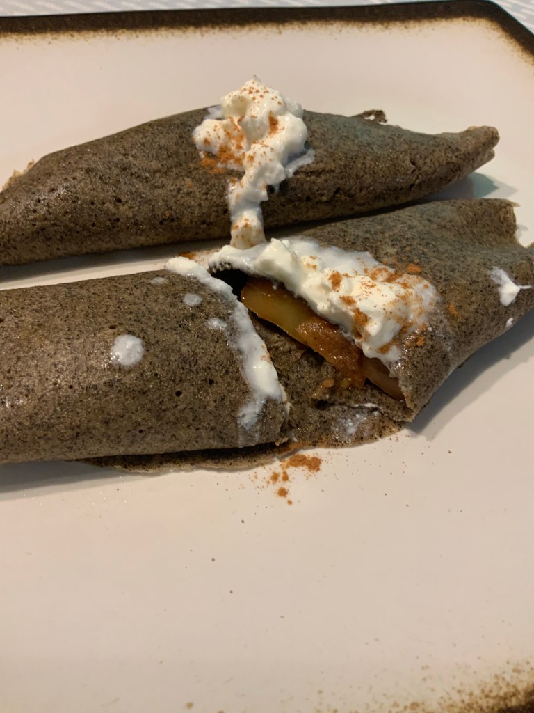 I think Iβm just not a buckwheat fan. I will finish this batch of crepes though. The apples only took about 30 minutes to cook yesterday and are easy to store and reheat for the crepe recipe. I think the apples along with the small amount of Greek yogurt on top of the crepes were my favorite part. Honestly, I think taking a cup of Greek Yogurt and adding the cooked apples and sprinkling cinnamon would be a more enjoyable breakfast for me.