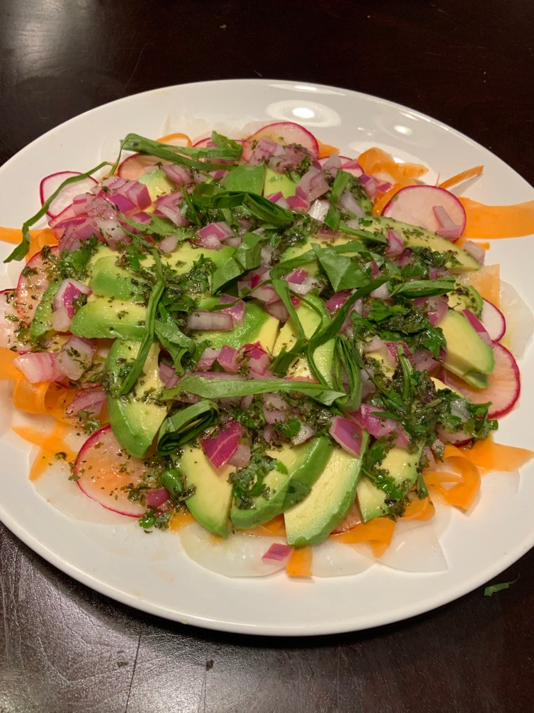I really liked the daikon radish in this dish. This salad is from Italy according to the cookbook. You layer daikon radish, shaved carrot, shaved red radish with avocado slices. You top it with pickled onion and an oil and lemon juice herby sauce. I plan to use this tomorrow to make a hummus and veggies sandwich similar to Panera Bread’s Mediterranean Veggie Sandwich
