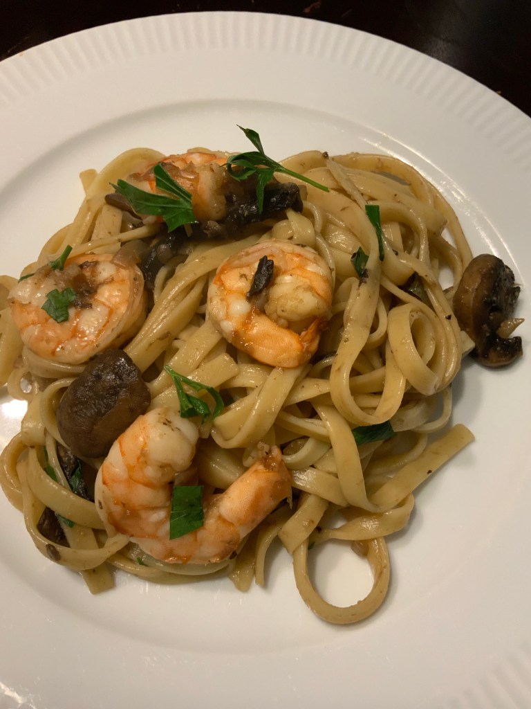 The original recipe calls for tagliatelle but I couldn’t find any at my local Lidl so I used fettuccine instead. Also, I added shrimp for extra protein.
