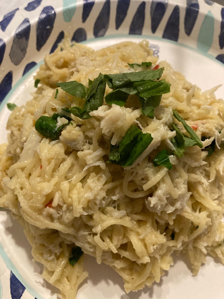 Starting back up again with a new cookbook. I’m trying out dishes from an Australian cookbook. This dish my boyfriend selected first. The recipe called for spaghetti but I found fresh Angel Hair, plus we both prefer that noodle. I used lump crab from Wegmans. I loved how quick and easy this dish was, it was ready in under 30 minutes. I dialed back on the Chile since I didn’t want it to overwhelm this dish, but if I make this one again, I won’t do that. The only critique was that I overcooked my pasta, but that was user error of mine with a new pot 🙂